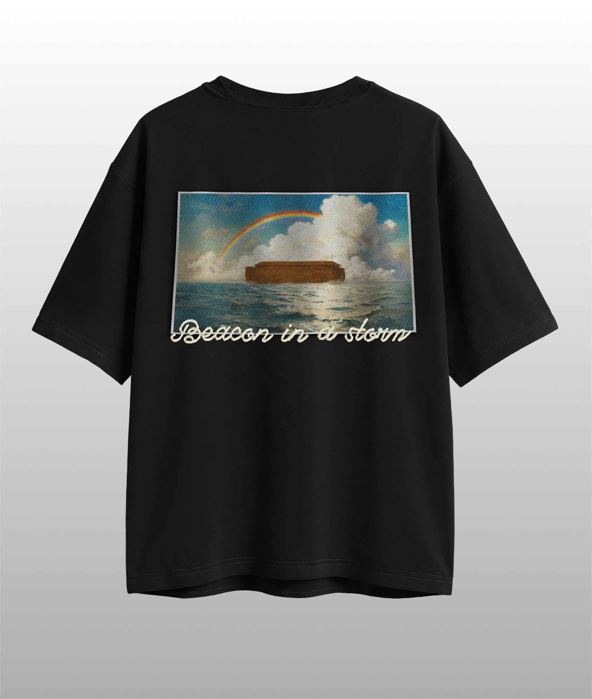 Beacon in a Storm is a premium unisex oversized t-shirt that captures the essence of hope and resilience through contemporary streetwear design. This graphic tee draws inspiration from timeless tales of survival and unwavering faith during life's greatest challenges. Featuring a striking digital print on twill canvas fabric at the back, this piece tells a story of finding light in darkness and strength in adversity. The deep Jaguar Black colorway creates a bold, versatile foundation that pairs effortlessly with any style.