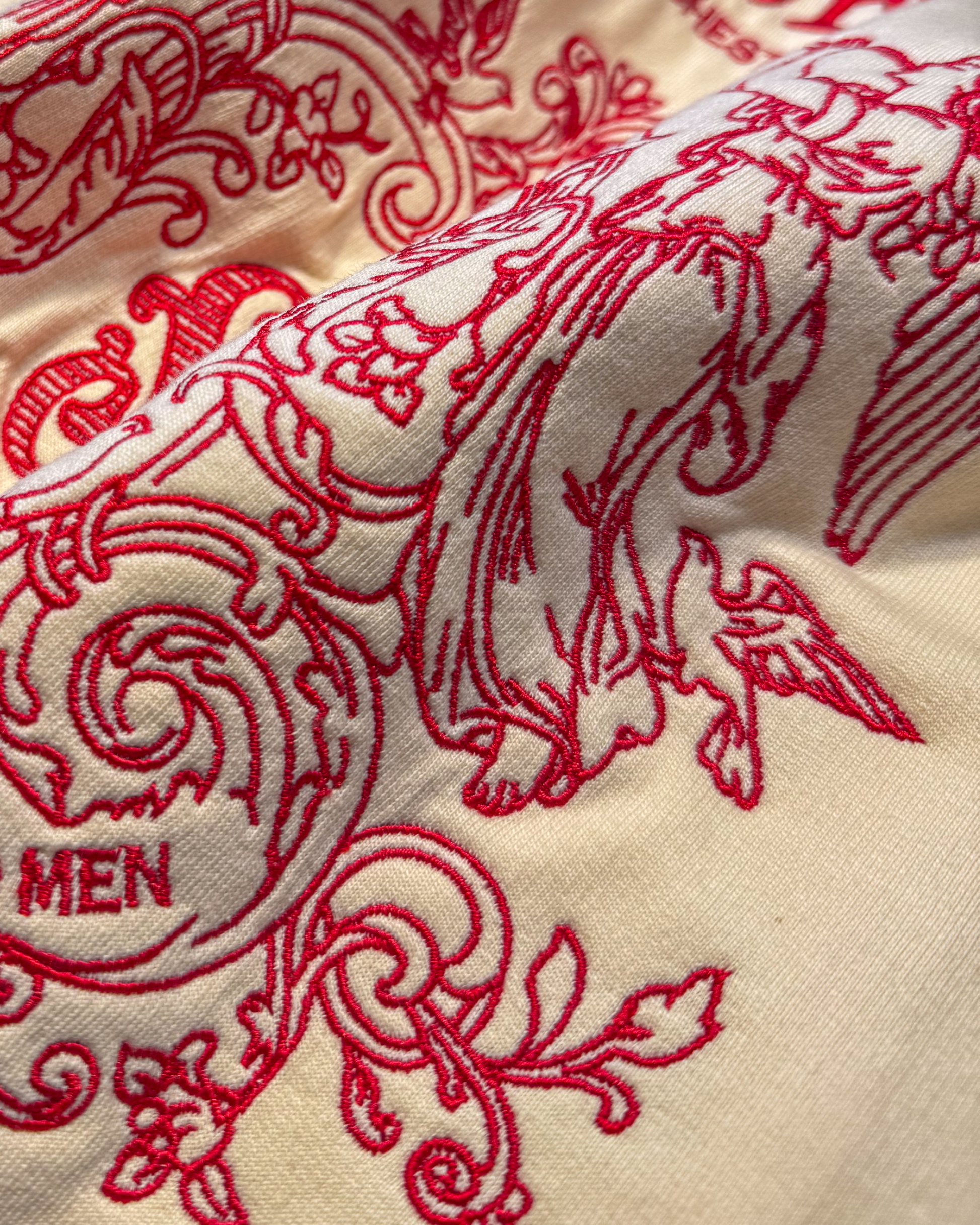 Crafted in premium 240 GSM French terry fabric, this oversized fit t-shirt delivers exceptional softness, comfort, and breathability. The loop knit construction ensures durability with a structured drape that maintains its shape wear after wear. The elaborate embroidery work elevates this piece beyond typical streetwear, making it a true collector's item for those who appreciate artisanal detail. Perfect for casual wear, special occasions, or everyday comfort, this graphic t-shirt pairs beautifully with neutral or earthy tones. A statement piece for those who value premium quality, artistic excellence, and clothing that carries messages of peace and goodwill.