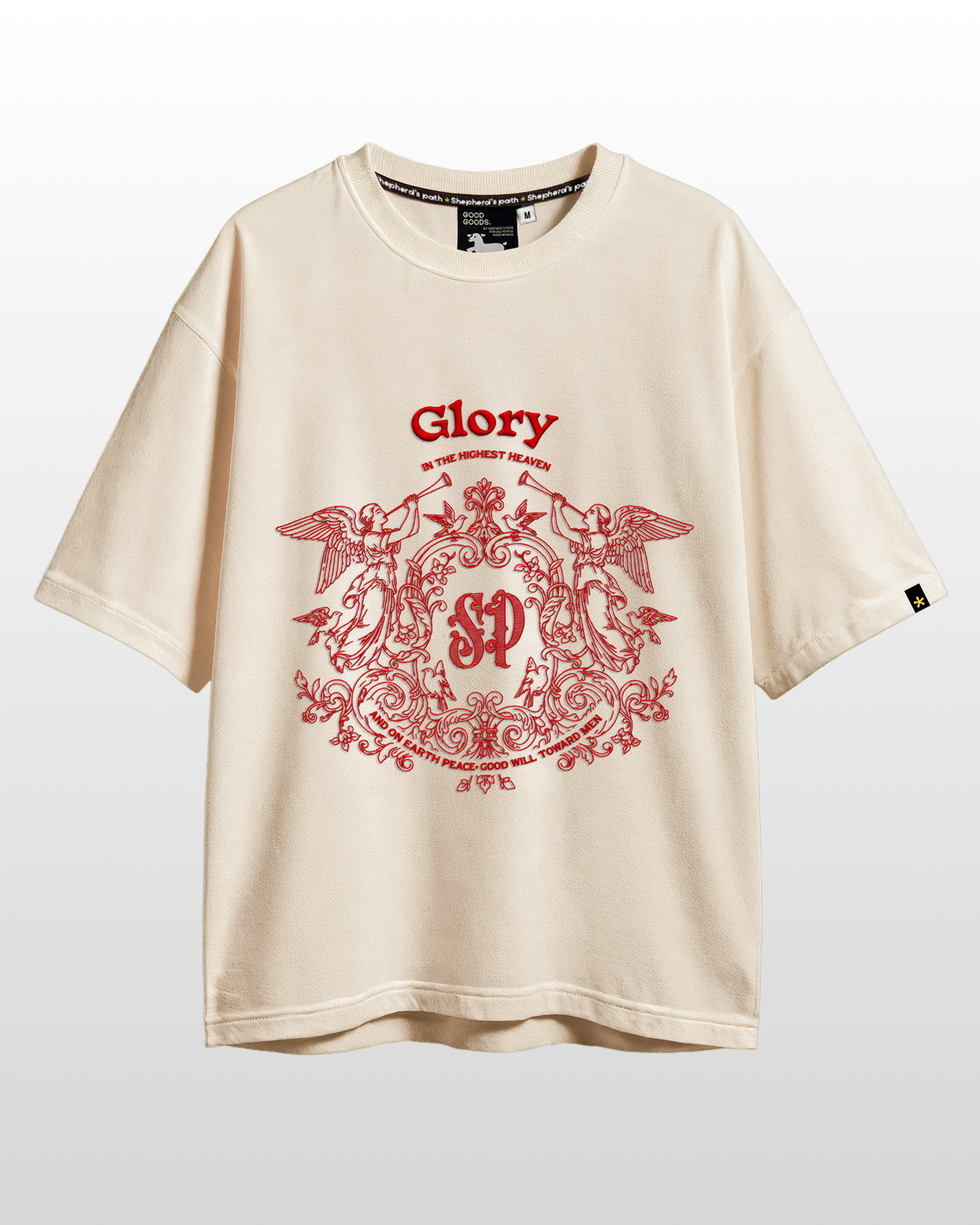 Glory in the Highest is a premium unisex oversized t-shirt that celebrates divine beauty, peace, and celestial artistry through intricate embroidery work. This graphic tee features a stunning visual of angels playing trumpets, brought to life with complex, high-quality embroidery that showcases exceptional craftsmanship and attention to detail. The design is framed by meaningful text—"Glory" in bold prominence, "in the highest heaven" positioned above, and "on earth peace, good will towards men" gracefully placed below the illustration. The soft peach colorway provides a gentle, elegant canvas that allows the intricate embroidery to truly shine.